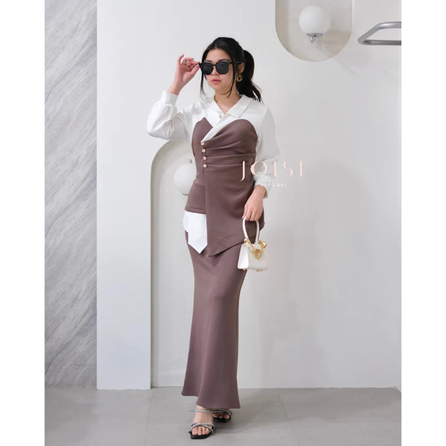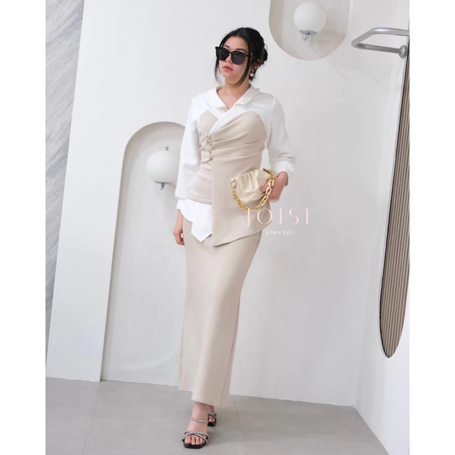 Perpaduan atasan asimetris dan rok mermaid yang menciptakan siluet tubuh ramping, anggun, dan berkelas seketika.